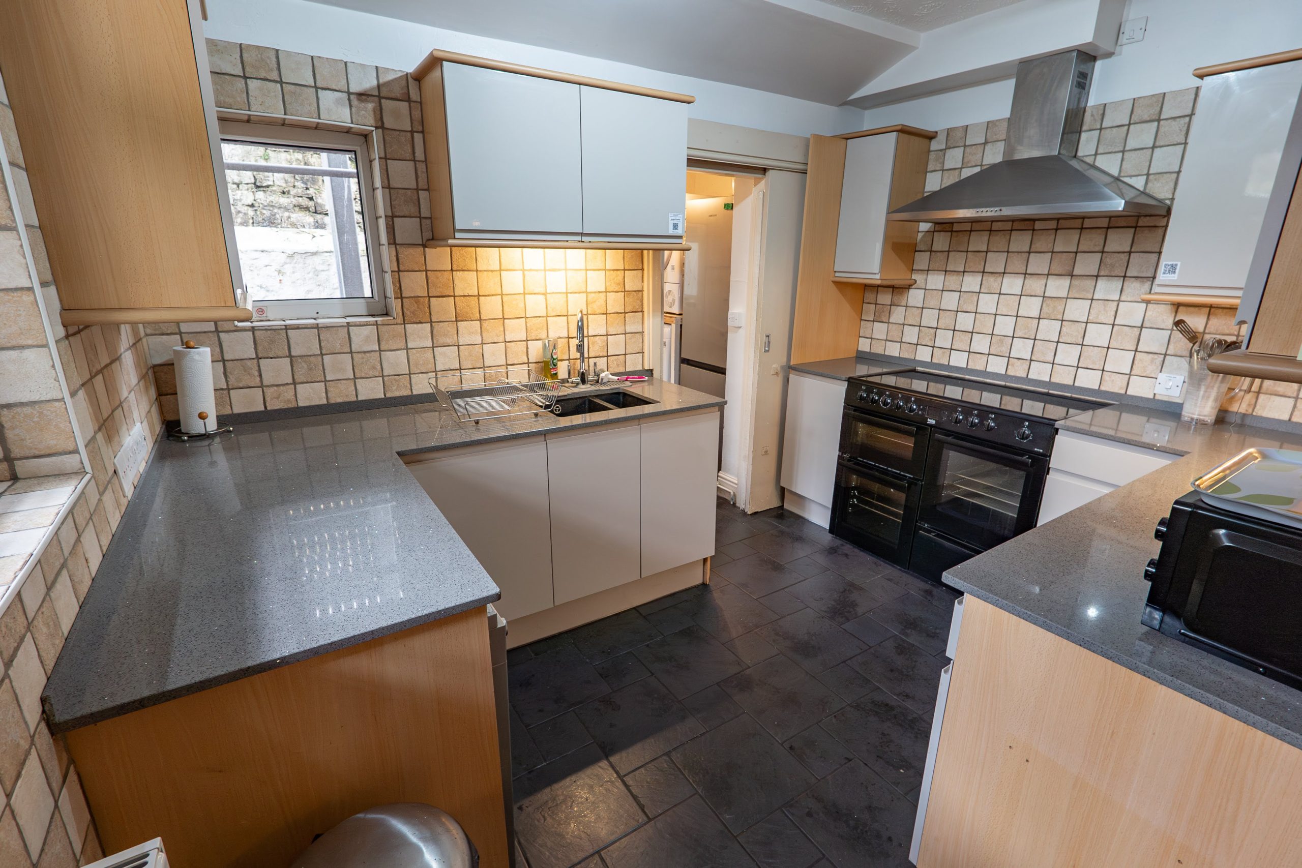 Modern kitchen with oven and hob, dishwasher, refrigerator